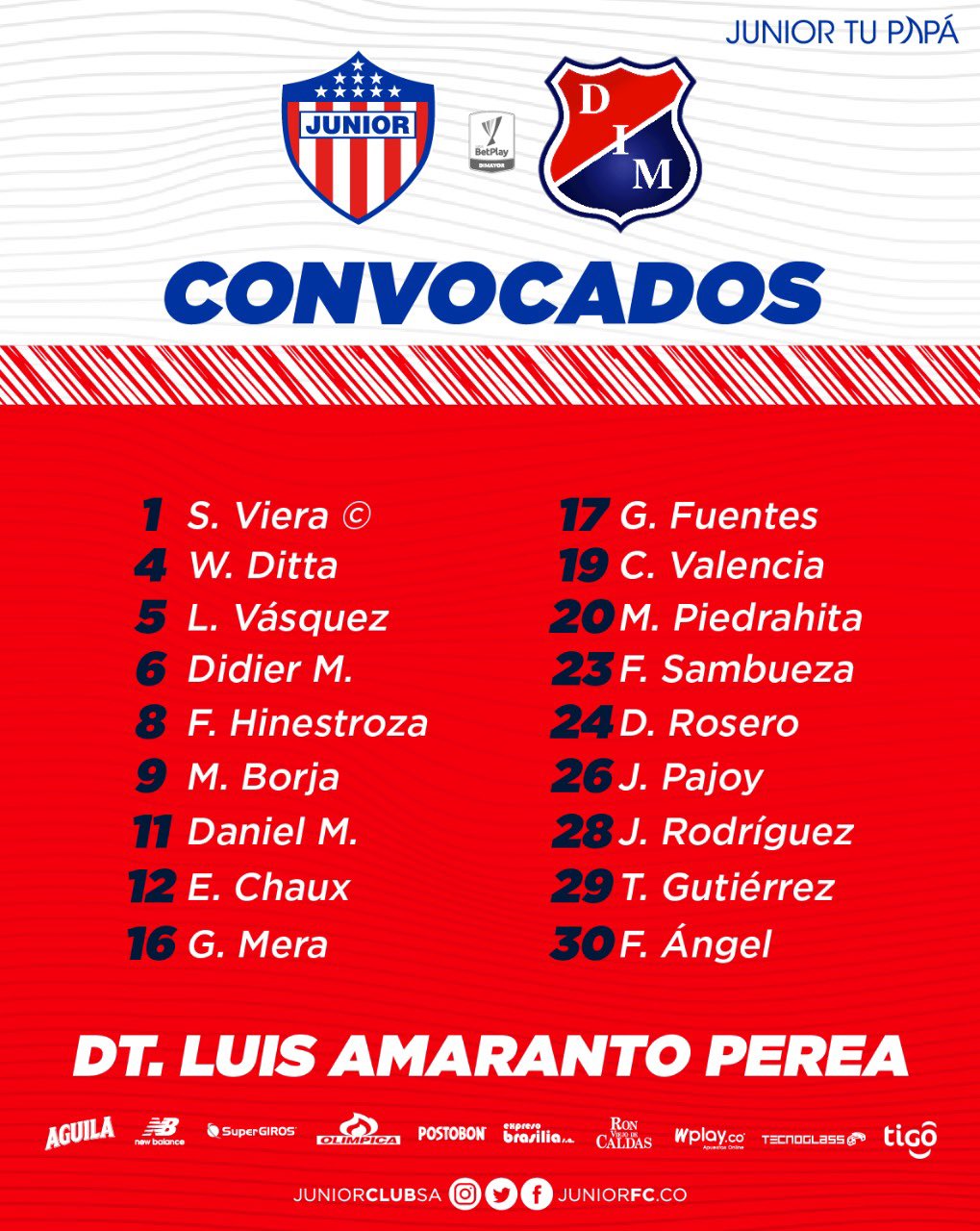 Luis Amaranto Perea, técnico de Junior, entregó la noche de este viernes la lista de convocados para debutar este sábado en la Liga colombiana.