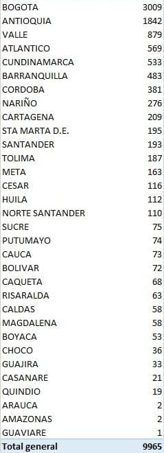 Bogotá vuelve a ser la entidad territorial con más casos de Covid-19 con 3.009, seguido de Antioquia con 1.842; Valle 879; Atlántico con 569; Cundinamarca, 533, Barranquilla, 483; Córdoba 381, Nariño, 276 y Cartagena, 209.
