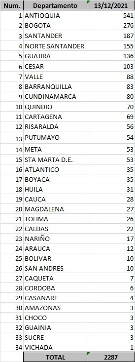 Se registraron 6 decesos en Antioquia, 3 en Valle del Cauca, 3 en Cartagena, 2 en Bogotá y 2 en Santa Marta.