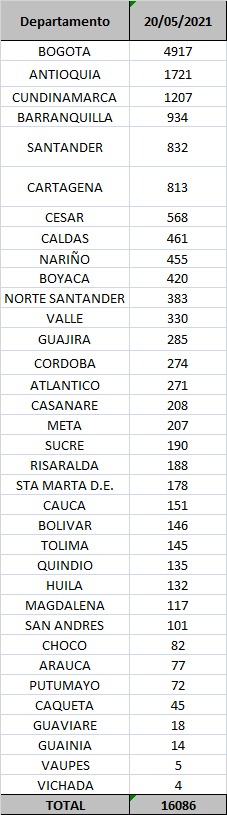 Mapa de Colombia de casos de Covid-19 a 20 de mayo de 2021