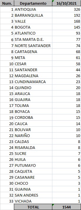 Se informan además, 5 muertes en Valle, 4 en Antioquia, 2 en Bogotá, 2 en Santa Marta y 2 en Cartagena.