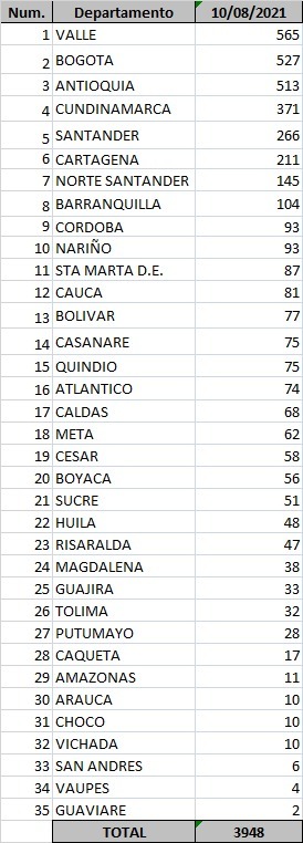 En la fecha, Valle tiene el mayor número de contagios con 565, seguido de Bogotá con 527 y Antioquia, con 513.
