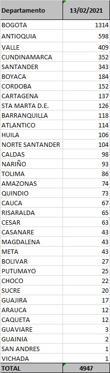 Lista de caso reportados el 13 de febrero por regiones de Colombia