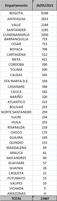 Lista de casos de Covid-19 reportados 26 de mayo de 2021