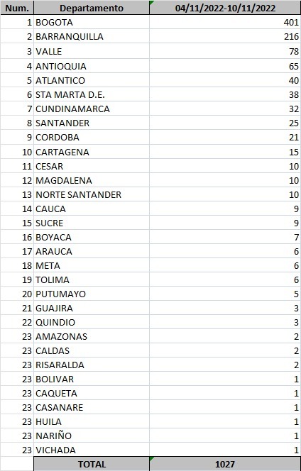 En el país se registraron 1.027 casos nuevos y 12 fallecidos, en la semana del 4 al 10 de noviembre.