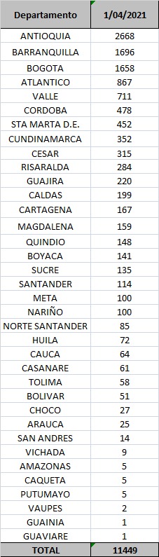 Mapa de Colombia de Covid-19 por regiones a 1 de abril de 2021
