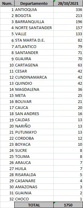 Mapa de Colombia de casos acumulados de Covid-19 - 28 de octubre de 2021
