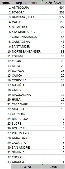 Mapa de Colombia de casos acumulados por Covid-19 - 23 de septiembre de 2021