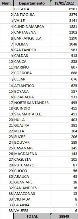 Mapa de Colombia de casos acumulados de Covid-19 a - 18 de enero de 2022