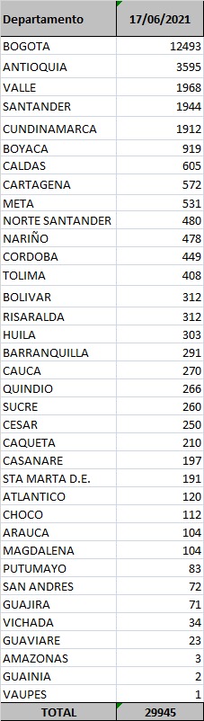 Lista de casos de Covid-19 por regiones de Colombia - reportados 17 de junio de 2021
