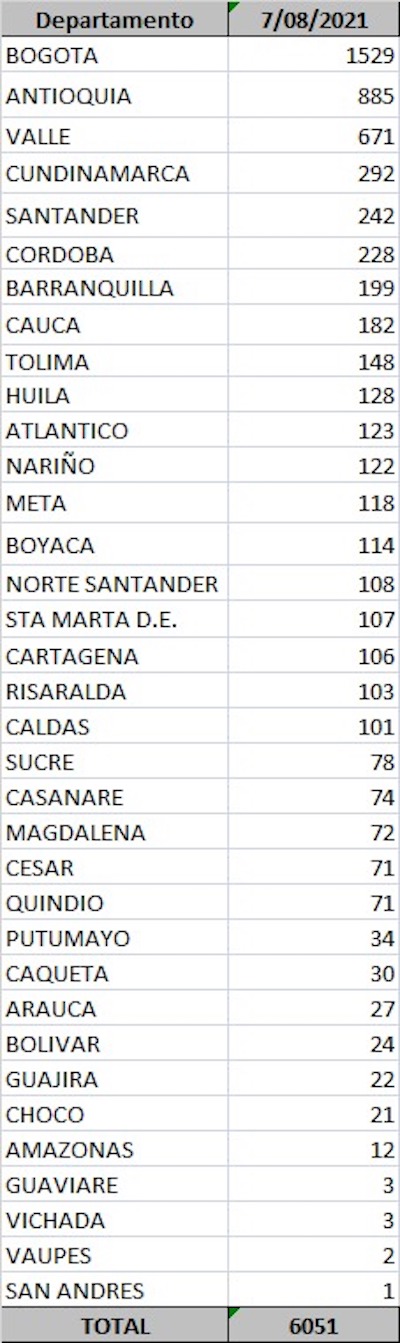 Mapa de Colombia de casos de Covid-19 a 7 de agosto de 2021