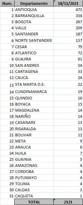 Lista de casos de Covid-19 a noviembre 18 de 2021