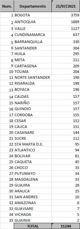 Se registraron 64 muertos en Bogotá, 61 en Valle del Cauca, 34 en Antioquia, 3 en Cartagena y 1 en Santa Marta.