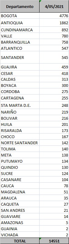 Mapa de Colombia por regiones y casos de Covid-19 a 4 de mayo de 2021