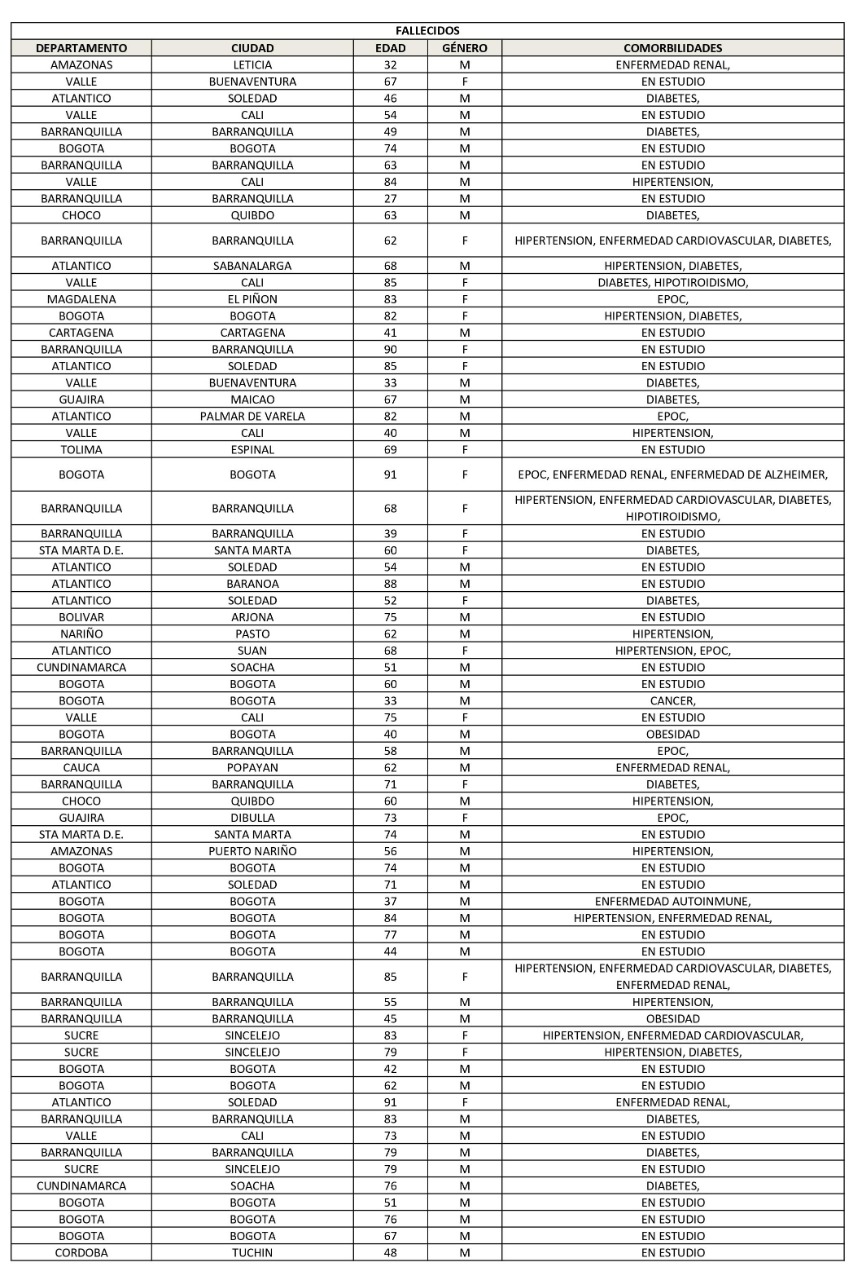 A Barranquilla, por su parte, le han confirmado 954 fallecidos, con los 46 decesos reportados en el presente informe diario.