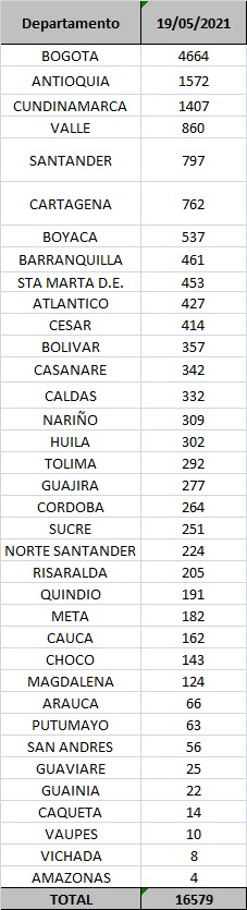 Mapa de Colombia de casos de Covid-19 a 19 de mayo de 2021