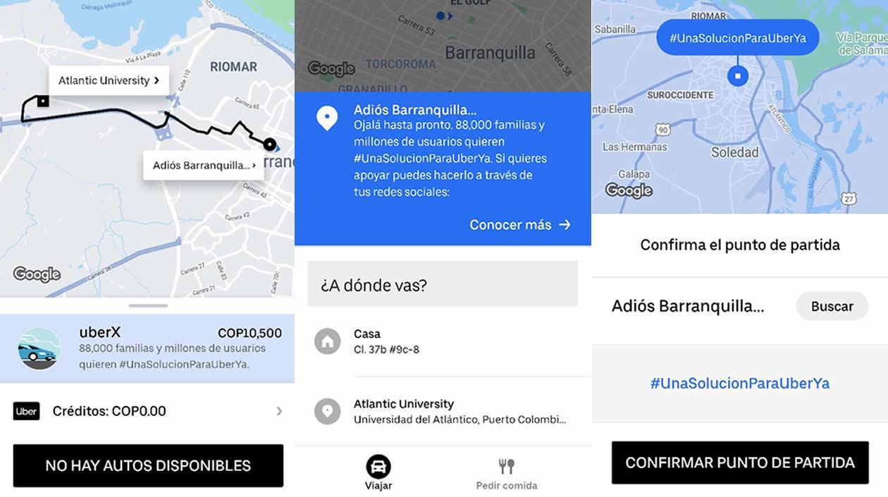 Al ingresar a la plataforma en la capital del Atlántico se lee: "Adiós Barranquilla... Ojalá hasta pronto. 88 mil familias y millones de usuarios quieren #UnaSolucionParaUberYa. Si quieres apoyar puedes hacerlo a través de tus redes sociales" (SIC).