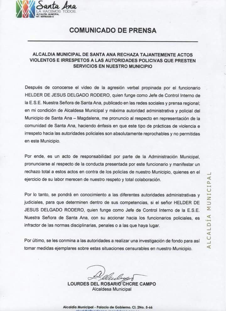 La Alcaldía identificó al protagonista del escándalo como Helder de Jesús Delgado Rodero, quien funge como Jefe de Control Interno de la E.S.E Nuestra Señora de Santa Ana.