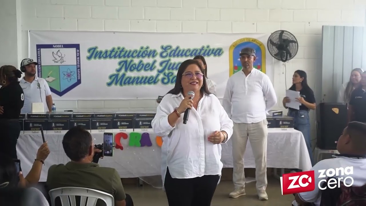 “Su alcaldesa sabe que la única fuente de desarrollo para nosotros seguir progresando en la educación ha invertido en un programa que se llama ‘Soledad Educa Digital’, el cual su finalidad es que los niños y niñas que se encuentran en décimo grado para que el próximo año, cuando estén en 11 grado, presenten las Pruebas Saber 11 y con esta herramientas tecnológicas va disminuir la brecha digital”, dijo la alcaldesa frente a los estudiantes del colegio Nobel Juan Manuel Santos.