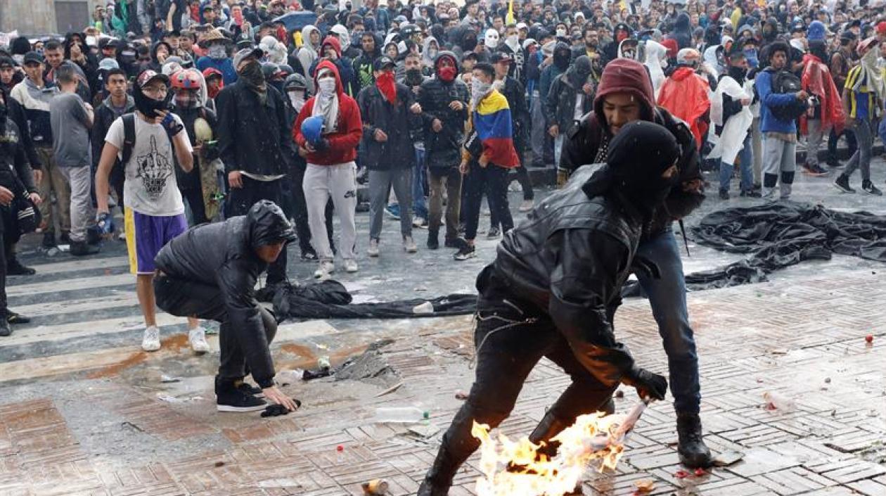 Una batalla campal entre vándalos encapuchados y la Policía colombiana se desató este jueves en la Plaza de Bolívar de Bogotá al cierre de las manifestaciones contra la política económica y social del Gobierno del presidente Iván Duque.