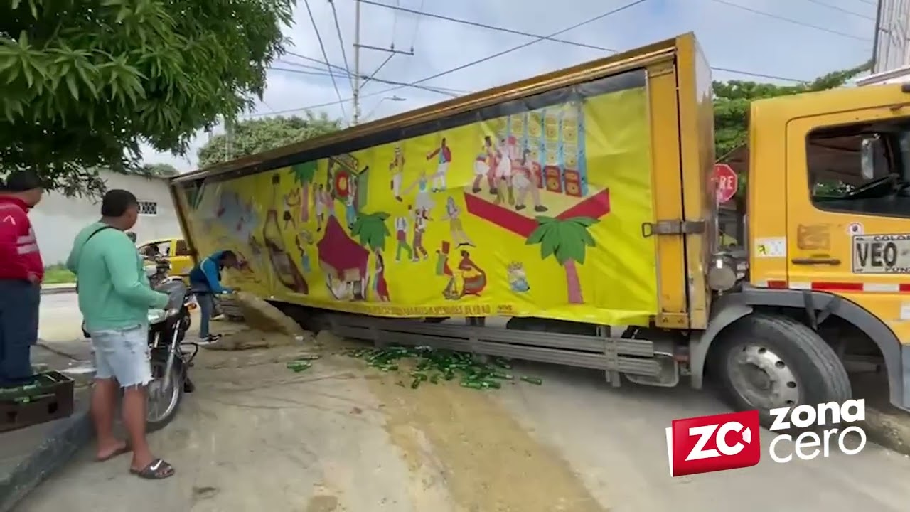 Un camión repartidor de cerveza quedó atascado en la mañana de este martes en la calle 77 con carrera 14, barrio La Esmeralda de Barranquilla, luego que la placa del pavimento cediera.