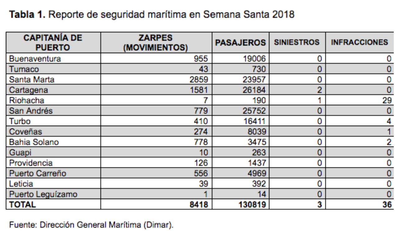 De acuerdo con el consolidado reportado en Dimar, los sitios que registraron mayor movimiento de transporte marítimo durante la Semana Santa, en su orden, fueron Cartagena, San Andrés, Santa Marta y Buenaventura.