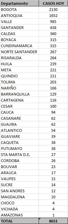 Bogotá rebasa nuevamente los 2.000 casos diarios, llega a 2.130, seguido de Antioquia con 1.652; Valle, 985, y más lejos Santander con 438 casos.