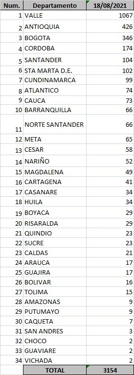 Mapa de Colombia de casos de Covid-19 a 18 de agosto de 2021.