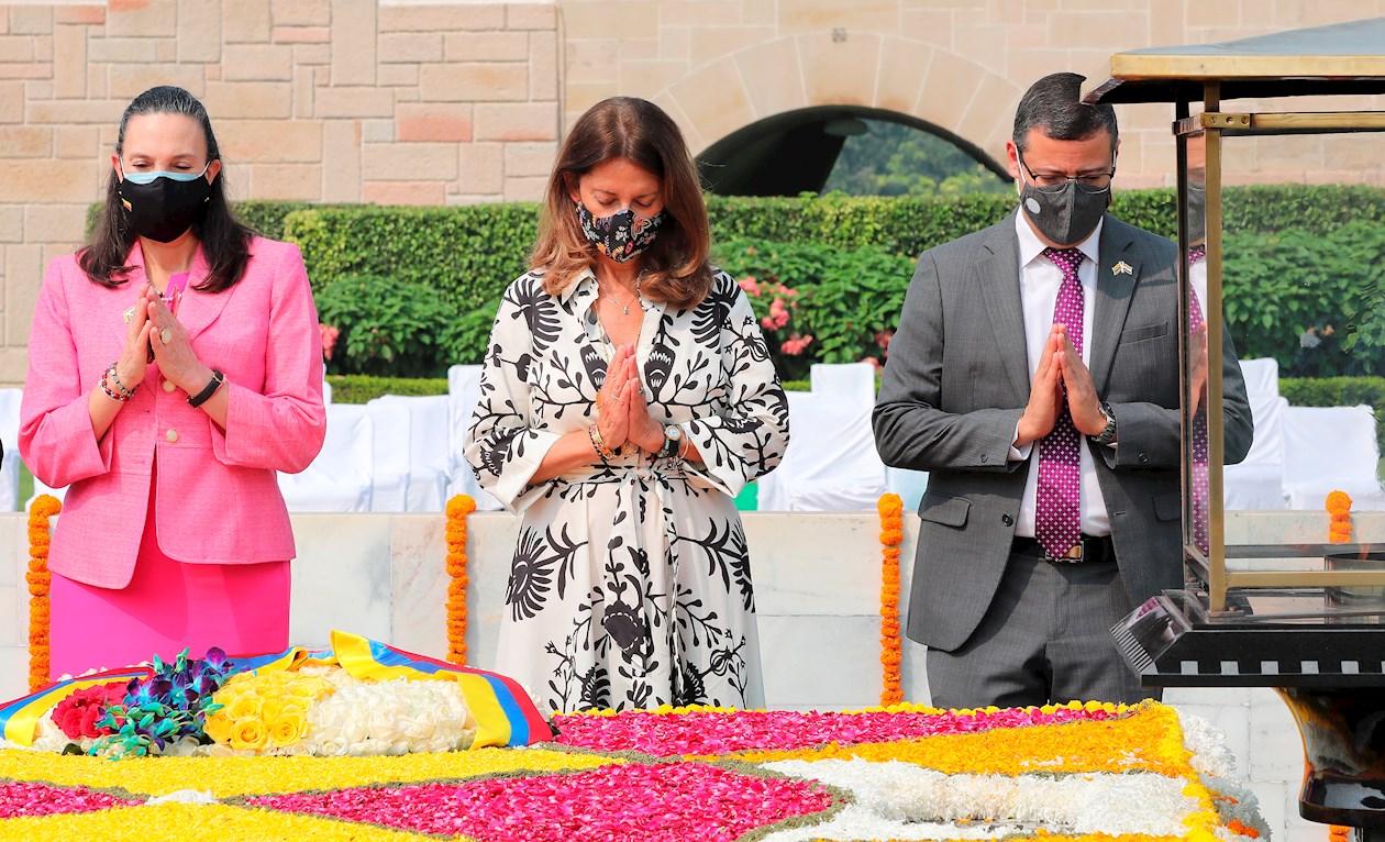 La canciller, que se encuentra en la India para trazar un plan que promueva la producción y distribución de vacunas en Colombia, aprovechó su estancia para rendirle tributo a Gandhi, en un acto por el Día Internacional de la No Violencia, que se celebra el 2 de octubre coincidiendo con el cumpleaños del líder pacifista indio.