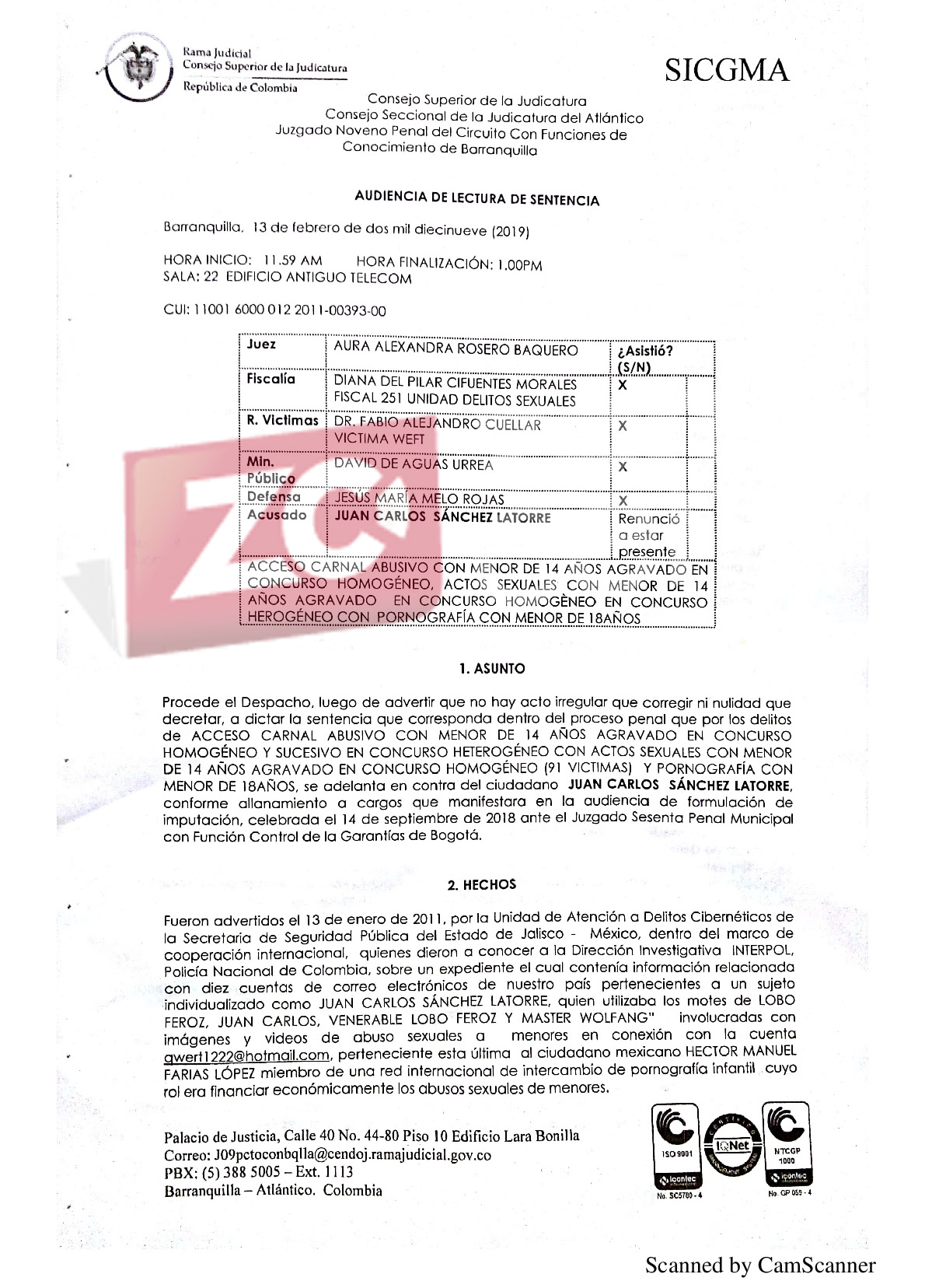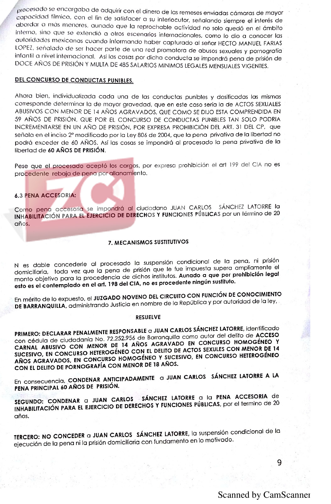 Sánchez Latorre, de 38 años de edad, fue sentenciado a pagar 60 años de prisión por 91 casos de acceso carnal con menores entre los años 2007 y 2009. Todo el material documentado fue recopilado por las autoridades judiciales.