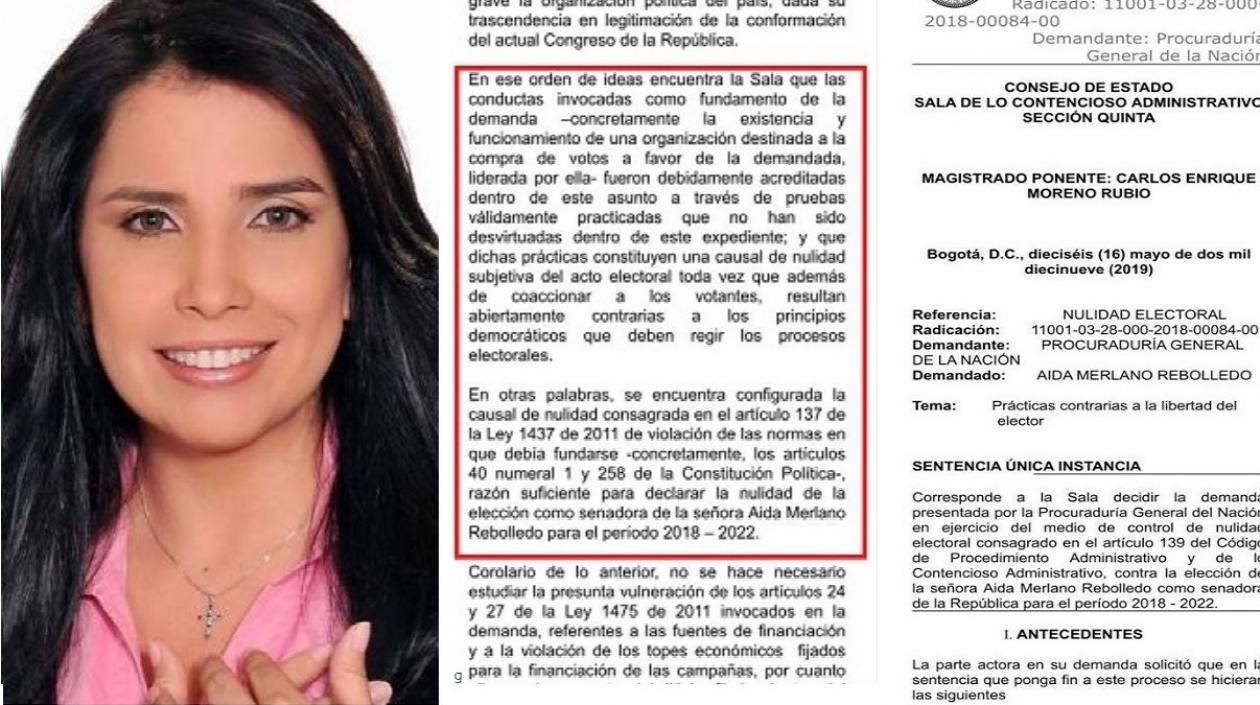 La sección quinta de la Sala de lo Contencioso Administrativo del Consejo de Estado, anuladó este jueves la elección de la dirigente conservadora Aida Merlano tras el escándalo de corrupción develado por la Fiscalía General de la Nación en marzo de 2018, cuando se elegía nuevo Congreso de la república.