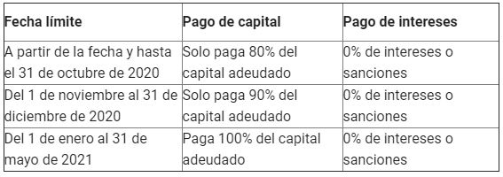 A partir de la fecha, los contribuyentes, responsables, agentes retenedores y demás obligados pagarían únicamente el capital adeudado por concepto de impuestos, tasas, contribuciones y multas pendientes de pago, de 2019 y años anteriores, sin intereses ni sanciones. Adicionalmente, podrán percibir un descuento importante en el valor del capital, dependiendo de la fecha en la que se acojan al beneficio, de la siguiente manera: