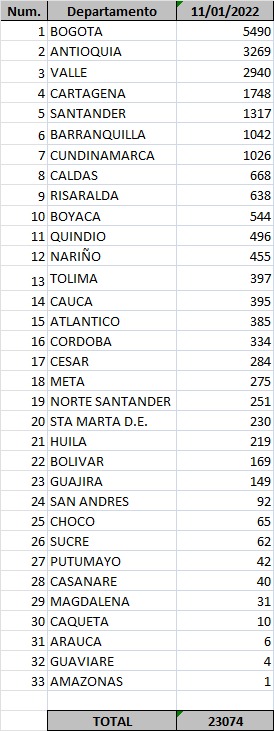 Mapa de Colombia de casos acumulados a 11 de enero de 2022