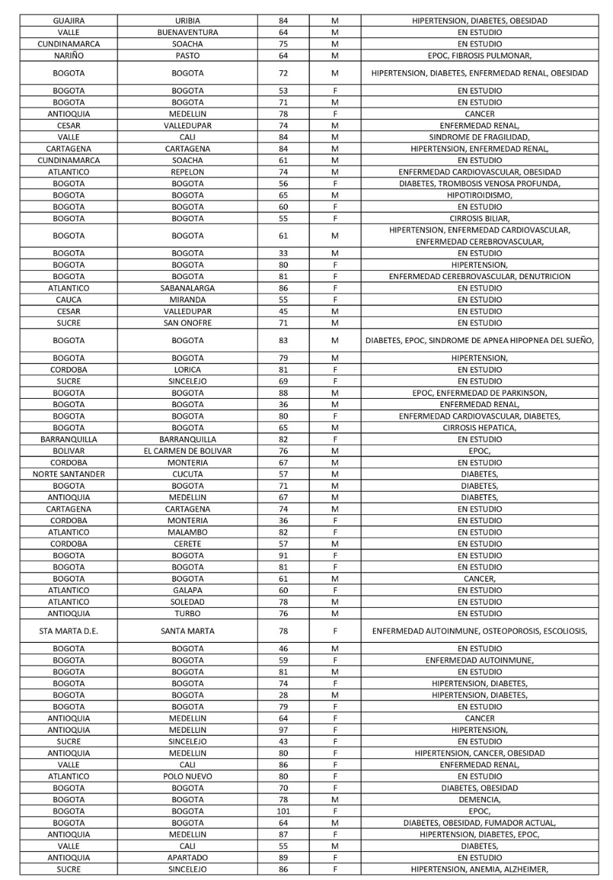 La cartera de salud agregó que hay 700 conglomerados en el país. Los territorios son: Amazonas, Antioquia (Ituango), Arauca, Atlántico, Barranquilla, Bogotá, Boyacá, Bolívar, Buenaventura, Caldas, Caquetá, Cartagena, Cauca, Cesar, Chocó, Córdoba, Cundinamarca, Huila, La Guajira, Magdalena, Meta, Nariño, Norte de Santander, Quindío, Risaralda, San Andrés, Santa Marta, Santander, Sucre, Tolima, Valle, Vaupés, Vichada, Guaviare y Guainía.