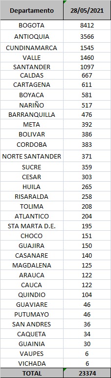 Mapa de Covid-19 por regiones de Colombia a 28 de mayo de 2021