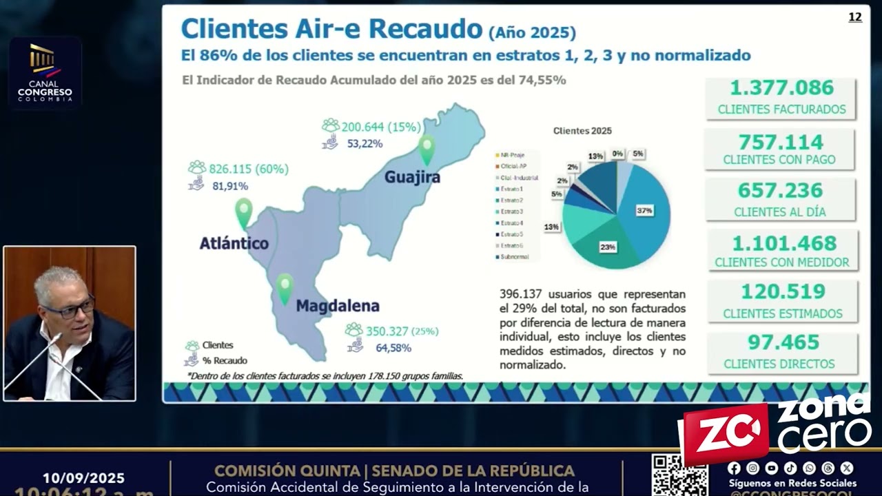 Air-e intervenida sigue con números en rojo. El agente interventor Nelson Vásquez Torres durante el debate de la Comisión Accidental de Seguimiento a la intervención de Air-e, en la Comisión Quinta del Senado, mostró la crítica situación de la compañía en materia de recaudo en lo que va de 2025.