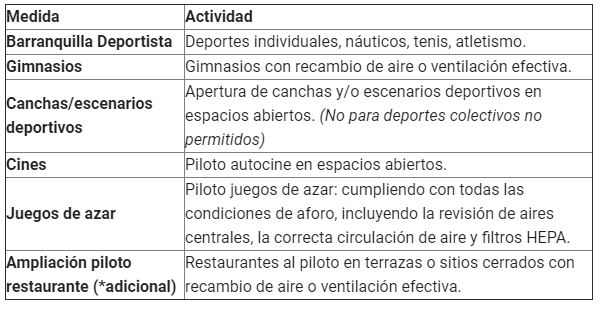 Seguido de la puesta en marcha del plan piloto del sector gastronómico, los ministerios de Salud y del Interior autorizaron pilotos para otras actividades, que la Alcaldía entrará a revisar para futuras reaperturas. Se trata de: