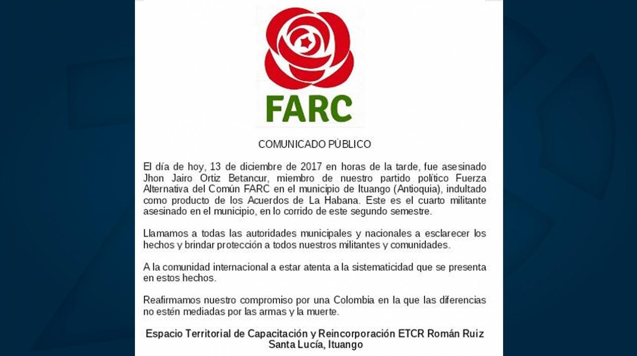 La exguerrilla llamó a las autoridades municipales y nacionales "a esclarecer los hechos y brindar protección" a todos sus militantes y comunidades, al tiempo que pidió a la comunidad internacional a "estar atenta a la sistematicidad que se presenta en estos hechos".