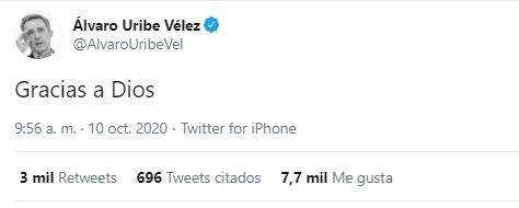 “Gracias a Dios”, escribió Uribe en su cuenta de Twitter.