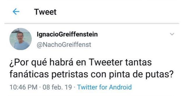 Este fue el comentario textual del funcionario: “¿Por qué habrá en Tweeter tantas fanáticas petristas con pinta de putas?”.