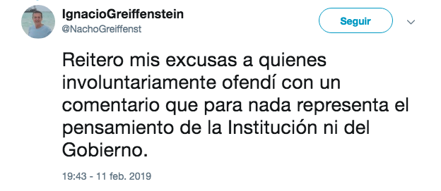 “Reitero mis excusas a quienes involuntariamente ofendí con un comentario que para nada representa el pensamiento de la Institución ni del Gobierno”, agregó.