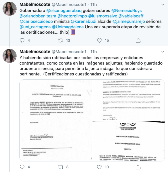 Habla de las irregularidades en las certificaciones que presentó Mabel Moscote Moscote, sobre los vínculos que tuvo con Interfilms Producciones de Televisión, Events y la Fundación Ecoregión.