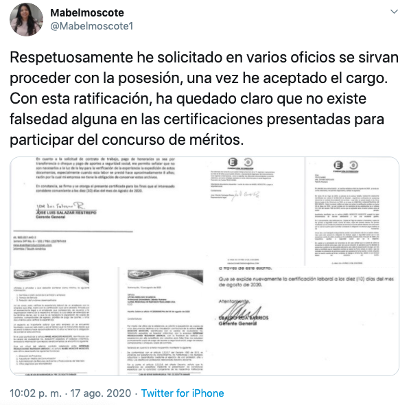 Tras citar a todos los mandatarios, a la Ministra, y a las universidades de Cartagena y el Magdalena, afirmó que "una vez superada" la etapa de revisiones de las certificaciones "y habiendo sido ratificadas por todos las empresas y entidades contratantes, como consta en las imágenes adjuntas; habiendo guardado prudente silencio, para permitir a la junta indagar lo que considerara pertinente, respetuosamente he solicitado en varios oficios se sirvan proceder con la posesión, una vez he aceptado el cargo".