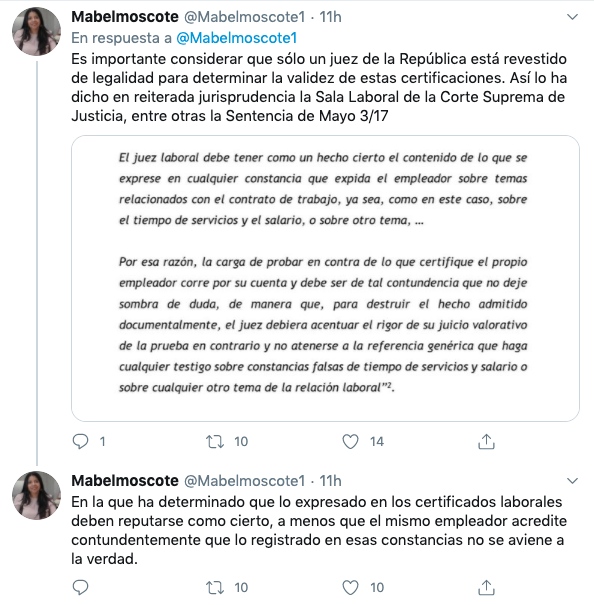 "Con esta ratificación, ha quedado claro que no existe falsedad alguna en las certificaciones presentadas para participar del concurso de méritos", agregó Mabel Moscote.