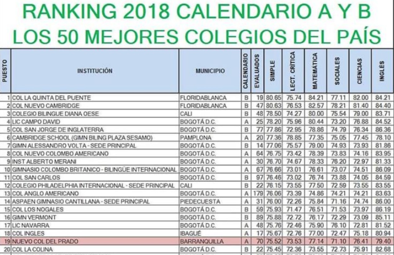 El Nuevo Colegio del Prado de Barranquilla es el único plantel educativo del Atlántico entre los 10 primeros lugares de la clasificación nacional de mejores puntajes, que se deriva de los resultados de las Pruebas Saber 11, que aplicó el Icfes para calendario A en agosto de este año y cuyos resultados se conocieron el 20 de octubre pasado.