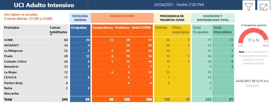 Sin embargo, la situación no deja de ser alarmante, pues el margen que se había ganado con las nuevas camas, ya se perdió y nuevamente la ciudad mantiene una ocupación por encima del 90%, a un riesgo muy alto de colapsar.