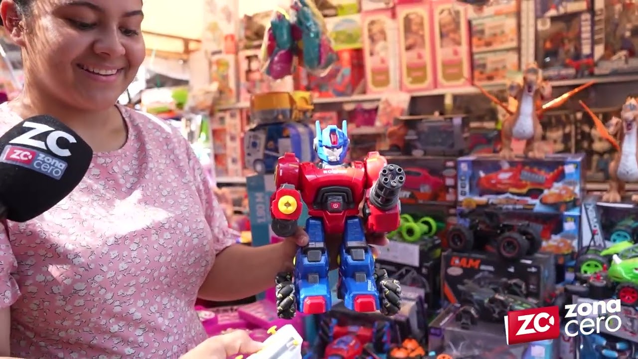 Jeily Alonso, comerciante del lugar, mostró los juguetes que tiene disponible en su local.