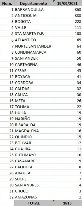 Se registraron 6 fallecidos en Bogotá, 6 en Valle del Cauca y 5 en Antioquia.