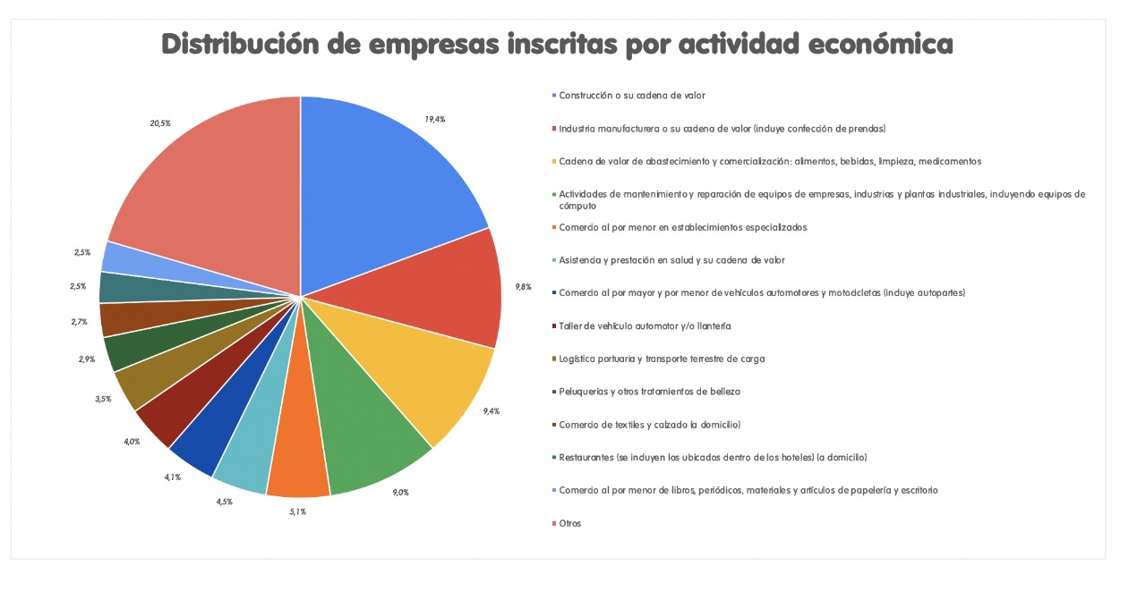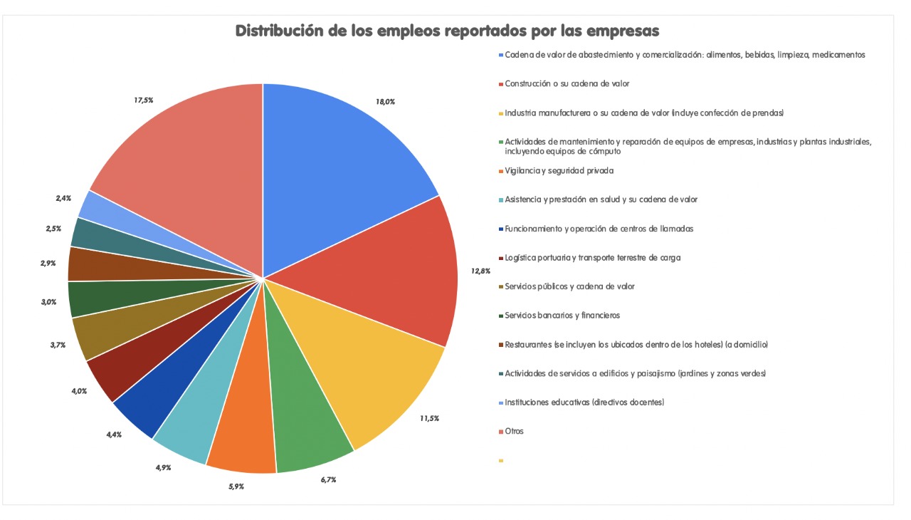 Cabe destacar que, de los empleados reportados, el 18% pertenece a la cadena de valor de abastecimiento y comercialización de alimentos, bebidas, limpieza y medicamentos; el 12,8% al sector construcción y su cadena de valor; el 11,5% a la industria manufacturera y su cadena de proveedores, incluyendo confección de prendas, y el 6,7% a actividades de mantenimiento y reparación de equipos de empresas, industrias y plantas industriales, incluyendo equipos de cómputo.