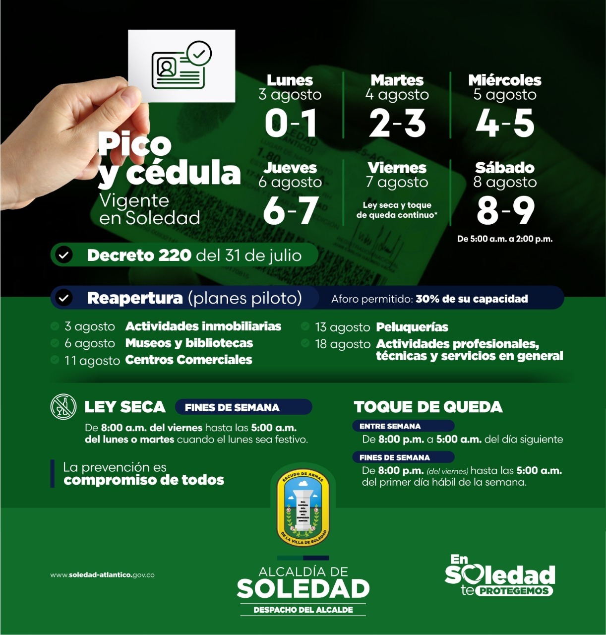 - Viernes festivo 7 de agosto: inicia el jueves 6 de agosto, a las 8:00 pm hasta las 5:00 am del lunes 10 de agosto de 2020. No obstante, se permitirá la salida el sábado 8 de agosto, mediante la medida de pico y cédula a las personas que los números de su cédula terminen en 8 y 9, desde las 5:00 am hasta las 2:00 pm.